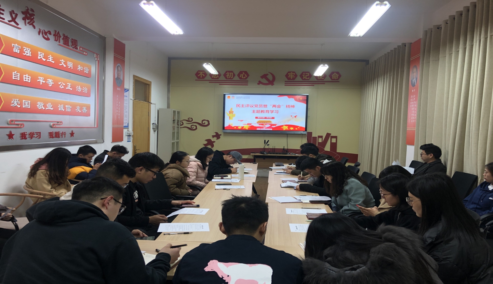 为认真学习和贯彻两会精神,提高党员的政治修养和素质,3月9日晚,Happy漫画 研究生第一党支部在学院401会议室组织学习“两会精神”。