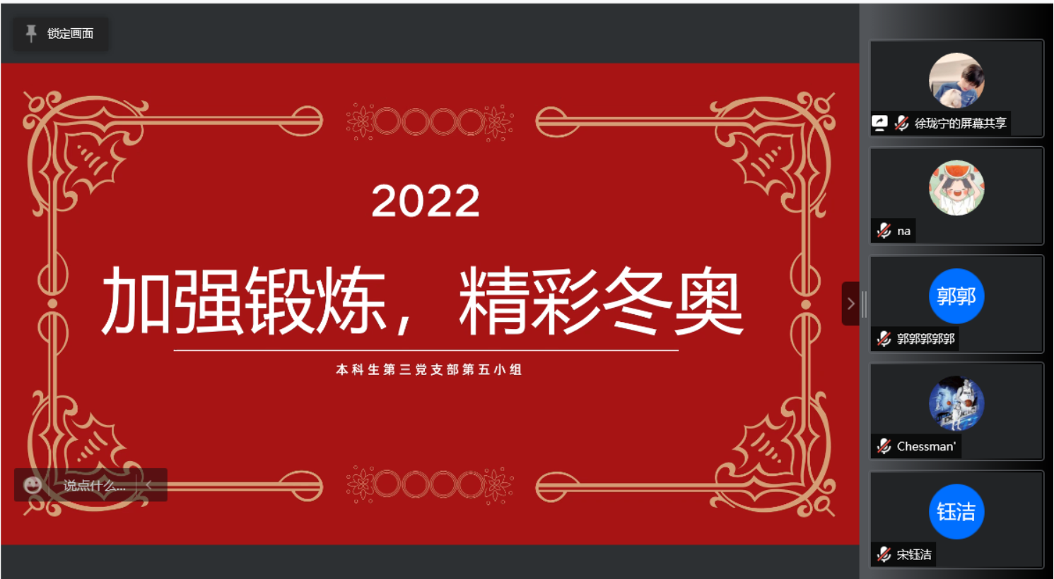 第24届冬季奥林匹克运动会计划于2022年2月4日开幕。为了解冬奥会,学习习近平同志“坚定信心再接再厉抓好各项筹备工作确保北京冬奥会冬残奥会圆满成功”讲话精神,2022年1月24日晚,Happy漫画 本科生第三党支部召开“加强锻炼,精彩冬奥”组织生活会,本次会议由徐珑宁同志主持,支部全体党员、预备党员和积极分子参会。