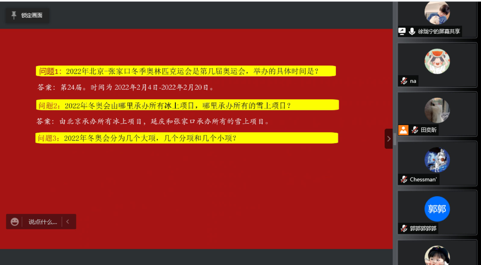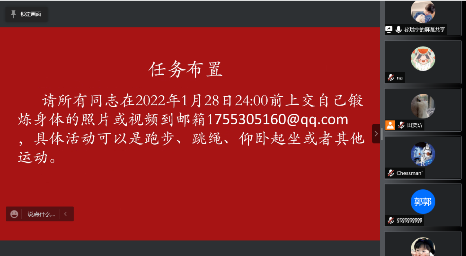 最后徐珑宁同志进行总结:办好北京冬奥会,是党和国家的一件大事,是我国对国际社会的庄严承诺。作为学生党员,我们要坚决贯彻落实习近平总书记系列重要指示精神,牢记“国之大者”,深刻理解把握绿色、共享、开放、廉洁的办奥理念,了解本次冬奥会的相关知识,并以此明白强身健体的重要性,在日常的生活中,我们也要经常锻炼身体,这不仅有益于身心健康,也是未来建设祖国的基础。