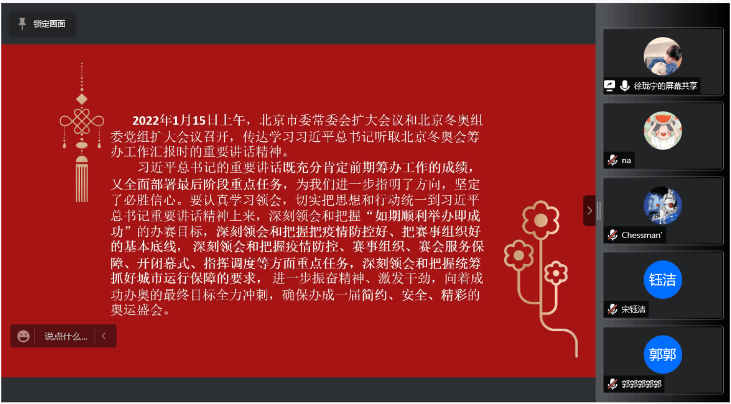 会议开始,全体起立奏唱国歌。其次任崇德同志带领学习习近平总书记的重要讲话精神,学习了“办奥理念”以及习近平总书记的五点强调。“办奥理念”:绿色、开放、共享、廉洁;五点强调:要坚持把疫情防控作为重中之重,确保冬奥安全、城市安全、人民安全;要扎实做好赛事组织,保证赛事安全顺利举办;要提高赛会服务保障精细化水平,努力让各方面满意;要加强统一指挥调度,形成办奥强大合力;要统筹抓好城市运行保障,营造良好城市环境。习近平总书记的重要讲话既充分肯定前期筹办工作的成绩,又全面部署最后阶段重点任务。第三部分任崇德同志简单介绍了此次冬奥会的基本知识。第四部分徐珑宁同志通过一个短片带领大家回顾了历届奥运的风采。