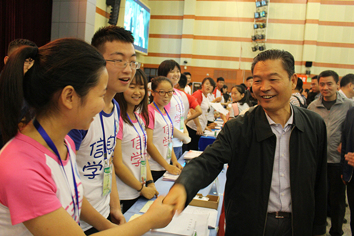 校党委书记李兴旺亲切问候独自一人来校报到的维族学生阿德尔江·阿布来提