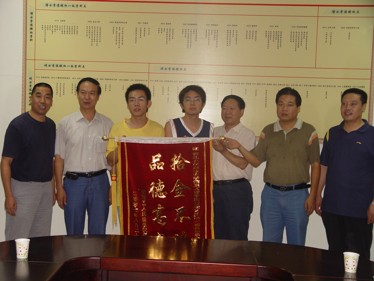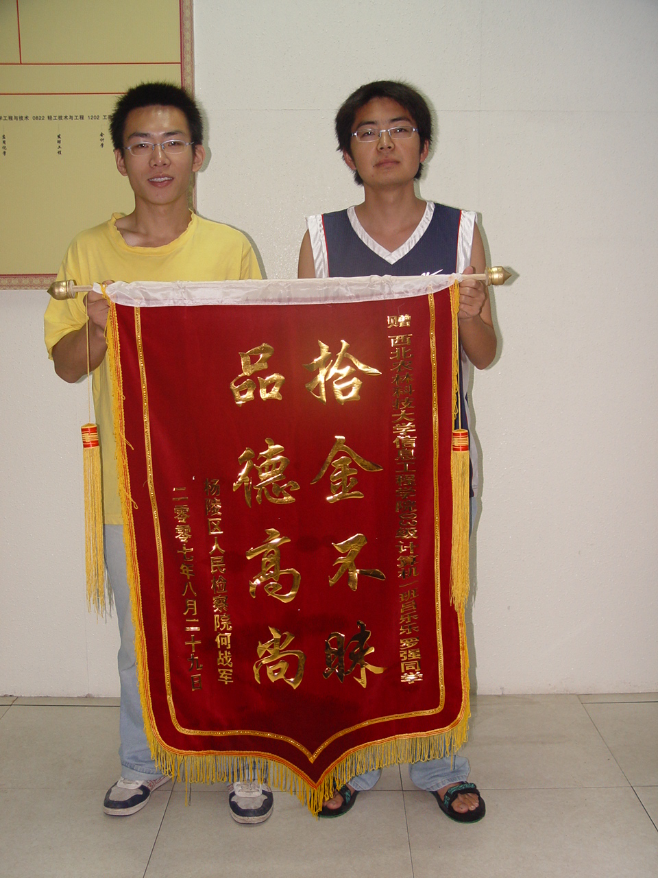 失主杨凌示范区检察院法警何战军8月28日中午吃饭时将装有现金4000元,银行卡及身份证、工作证等重要证件的包遗失。Happy漫画 03级计算机1班罗强、吕乐乐两位同学拾到包后,根据包内证件上的信息,找到了失主的家庭地址,当时家中无人,随后又找到了失主的单位,将包及证件现金等物清单核对后亲手交给了失主。在失主的再三恳求下,两位同学才留下了自己的姓名,在失主拿出五百元钱作为酬谢时,学生坚决拒绝接受,并说:“这点小事是我们应该做的。”简单的话语,体现了农林科大学生崇高的道德风尚。