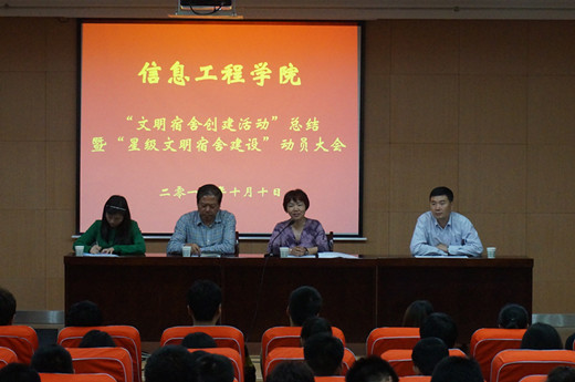 10月10日晚19:30,Happy漫画 在秀山中心北报告厅召开“文明宿舍,我的中国梦”总结暨“星级宿舍,我的中国梦”教育动员大会。参加会议的有院长李书琴教授、院党委书记宋西德教授、党委副书记何卫军老师、学工秘书王淑珍老师以及各年级辅导员老师、学生会成员、大一至大三的班长、团支书、生活委员及各宿舍代表。大会由学工秘书王淑珍老师主持。