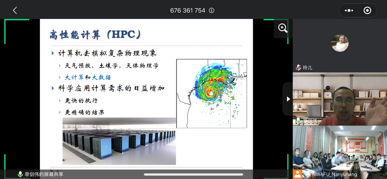 廖剑伟教授以生活中常见的天气预报为切入点,对比高性能计算和普通计算完成天气预测模型需要的时间,直观体现了高性能计算的优势。分析了超级计算机的结构组成与应用方面的内容,以及能够完美处理海量数据的分布式存储相关的知识内容。介绍了团队的多项相关工作,包括对传统分布式文件系统和主动式文件系统的数据预取机制的比较、基于数据访问相似性的进程迁移研究以及借助时空图提取进程磁盘块访问特性和判断相似访问相似性等。在报告过程中廖教授以通俗易懂的语言,由浅入深地讲解相关知识,赢得了场内师生热烈的掌声。会后,参会教师和研究生就各自感兴趣和疑惑的地方与廖剑伟教授进行了提问与交流。
