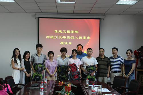 9月8日下午,Happy漫画 组织欢送2016年应征入伍学生,学院特邀校保卫处处长,学院领导和老师、班级同学代表与四位应征入伍的同学一同座谈。