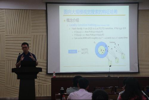 在报告中,纪荣嵘教授主要围绕两个方面的话题进行了深刻的讲解,一是面向大规模视觉搜索的特征哈希,主要从视觉数据近年来的爆炸性增长,大规模视觉搜索技术的紧迫需求以及面向大规模视觉搜索的特征哈希原理等方面进行了概念介绍;二是提出了深度神经网络压缩,介绍了深度神经网络在视觉中的应用,以及如何压缩网络模型等问题。最后,纪教授给全体师生展示了他们团队在目前该领域的相关工作进展以及对未来工作的展望。