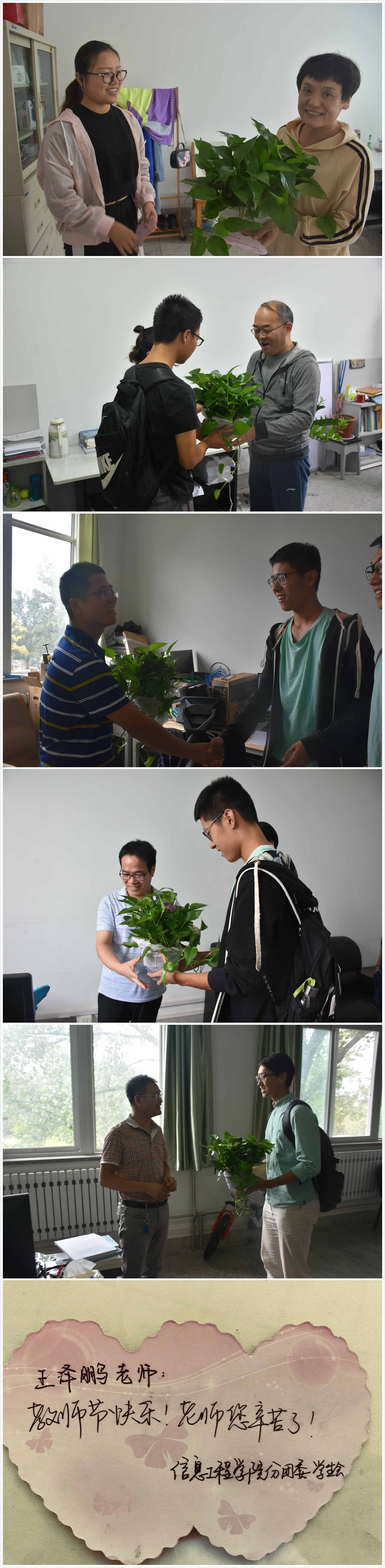 在教师节前的最后一个工作日,学院30余名学生干部代表全院学生手捧绿萝和精心撰写的小卡片来到学院办公楼,为每一位敬爱的老师送上他们节日的祝福。
