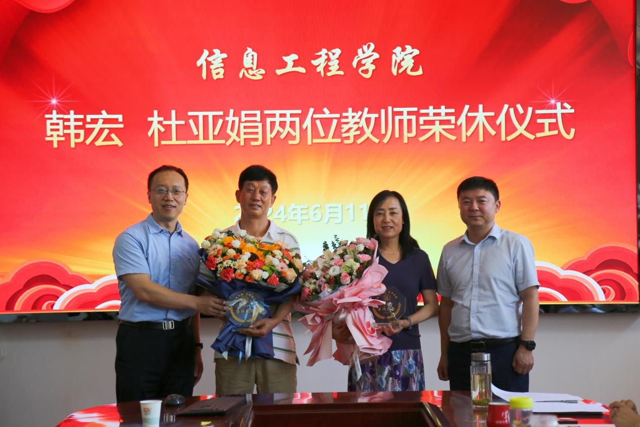 6月11日,学院为韩宏和杜亚娟两位教师隆重举办荣休仪式,党委书记党青和院长张宏鸣为荣休教师献花,并赠送纪念品。学院领导班子成员及各系(部)教师代表参加了活动,副院长崔卫芳主持会议。