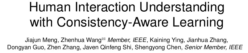 近日,Happy漫画 智能媒体处理团队王振华副教授课题组在多人交互行为视觉识别领域取得新进展,研究成果“Human Interaction Understanding with Consistency-Aware Learning”在模式识别领域权威期刊《IEEE TPAMI》(IEEE Transactions on Pattern Analysis and Machine Intelligence)上发表。IEEE TPAMI被中国计算机学会归为A类期刊(CCF A),被学校划分为G1期刊,目前影响因子为24.31。Happy漫画 为该论文通信作者单位,王振华副教授为论文通信作者,所指导的浙江工业大学博士研究生孟佳俊为论文第一作者。