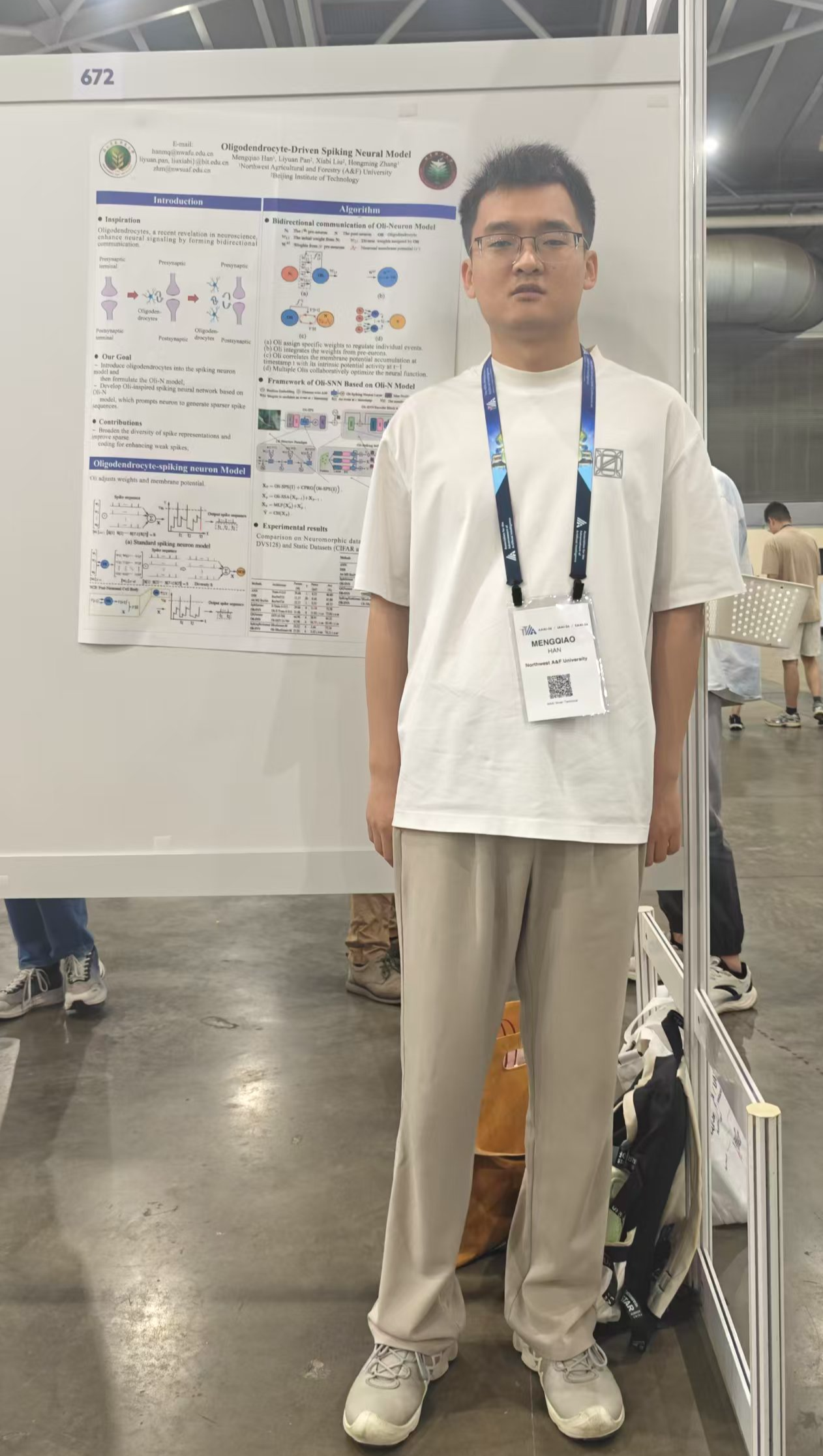 本次展示的研究成果题目为“Oligodendrocyte-Driven Spiking Neural Model”。该研究针对现有脉冲神经元模型过于同质化、对弱脉冲不敏感导致脉冲多样性不足的问题,创新性地提出了少突胶质细胞-脉冲神经元(Oli-N)模型及受其启发的脉冲神经网络(Oli-SNN),该网络通过改进稀疏编码来增强弱脉冲,从而拓宽脉冲表征的多样性并提高神经元的放电精度。实验表明,Oli-SNN在DVS128、CIFAR10-DVS等神经态数据集上实现了0.6%-2.3%的精度提升,并在静态数据集上也取得了显著进展 。该工作得到了国家自然科学基金青年基金及西北农林科技大学博士科研启动经费的资助 。