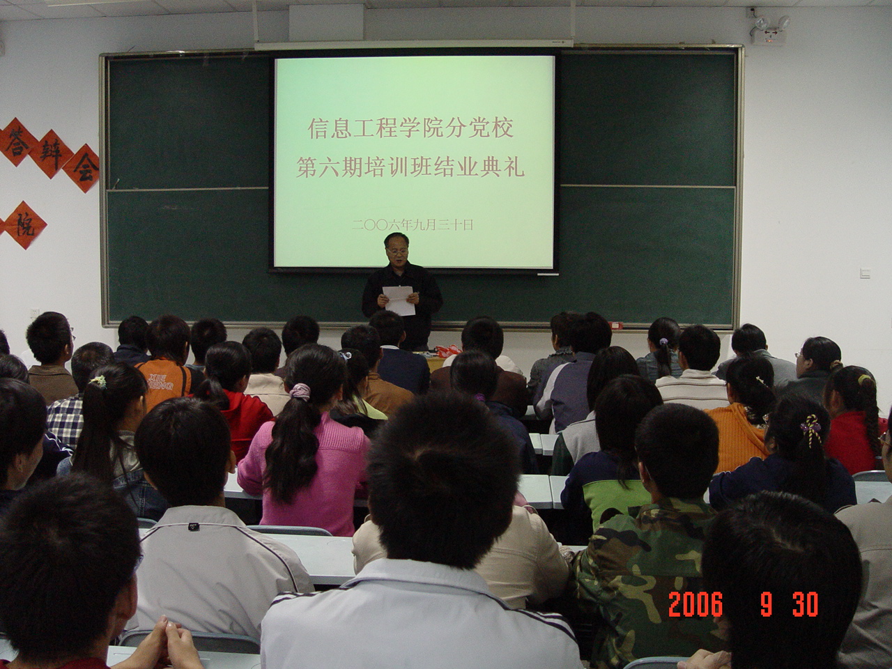 王书记首先宣读了第六期分党校学员名单和学院关于表彰7名优秀学员的决定,接着吕书记代表学院发言,他首先代表学院党委及全体党员向全体结业的同学表示热烈的祝贺,并向大家提出了两个方面的要求:一是用先进理论武装头脑,要求广大学员继续学习马列主义,积极向党组织靠拢;二是将对党的热情付诸于实际行动,未进党的门,先做党的人,最后优秀学员王峰同学代表全体学员发言,表示决不辜负党的期望,做党的坚强后盾。会议在热烈的掌声中结束。