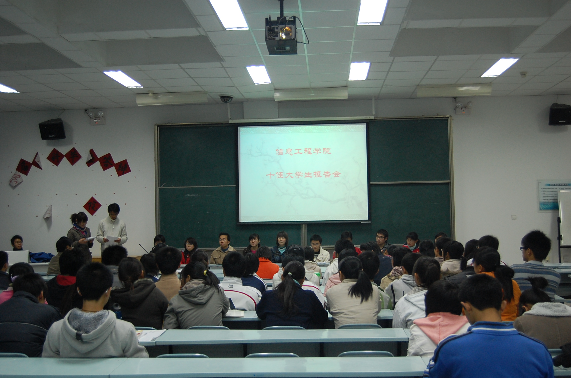 2007—2008学年院级“十佳大学生”。报告会开始,谷申杰老师简要介绍了本届学院十佳大学生评选情况及报告会的重要意义。接着,十佳大学生就自己学习、生活、工作以及进入大学后的所感所悟进行了经验介绍。他们都提到,专业课、高数和英语对每个学生都极为重要,一定要踏实认真地学,要树立坚定的目标,永不放弃。同时,鼓励新生多参加实践活动,提高自身综合素质,另外,他们还指出要与周围同学建立良好的人际关系,广交朋友。