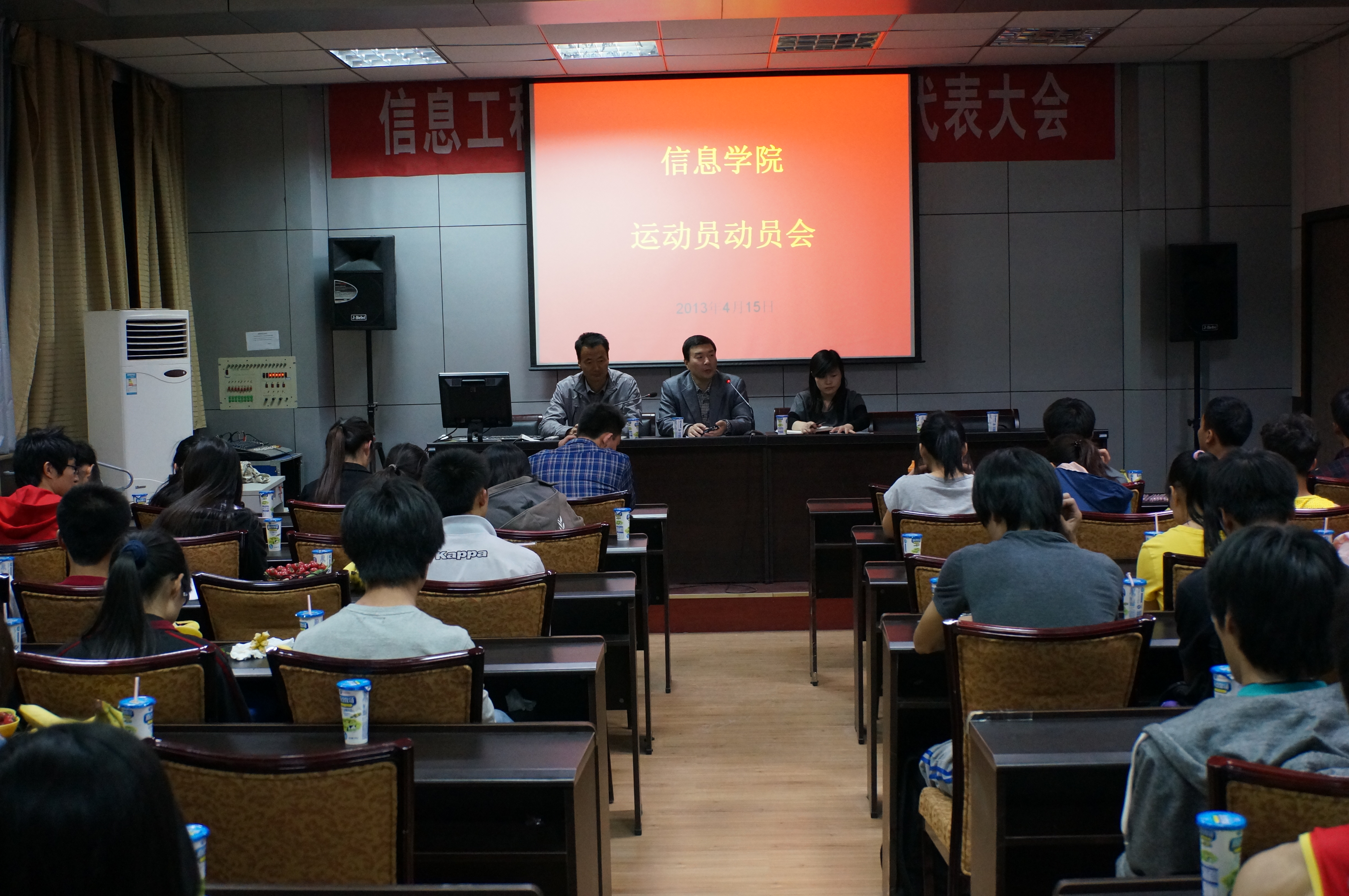 4月15日晚,Happy漫画 在二楼会议室召开2013年校田径运动会动员会。院党委副书记何卫军老师、体育辅导员杜养军老师、院学工秘书王淑珍老师、院学生会体育部成员及全院五十余名运动员参加了会议。