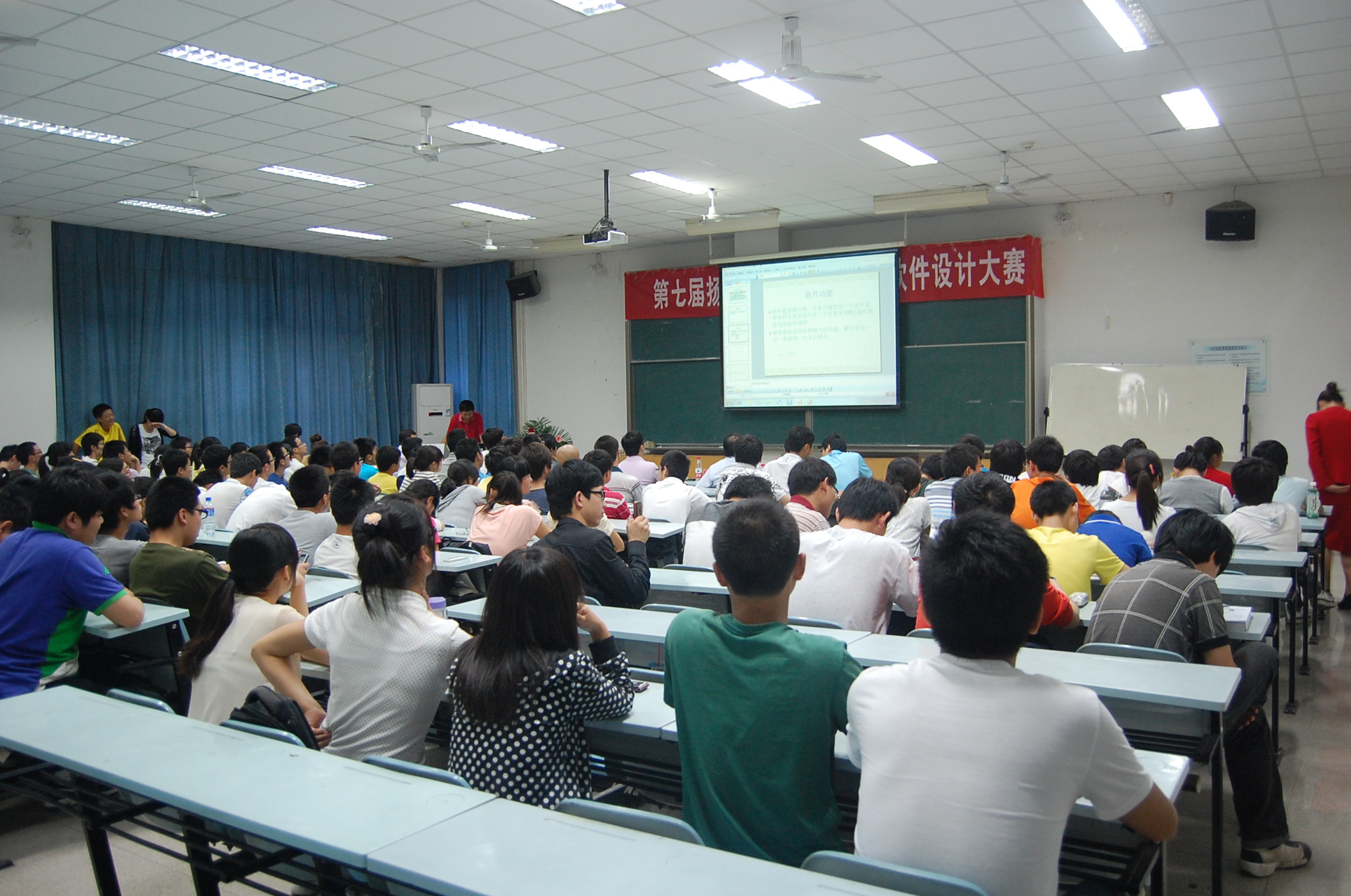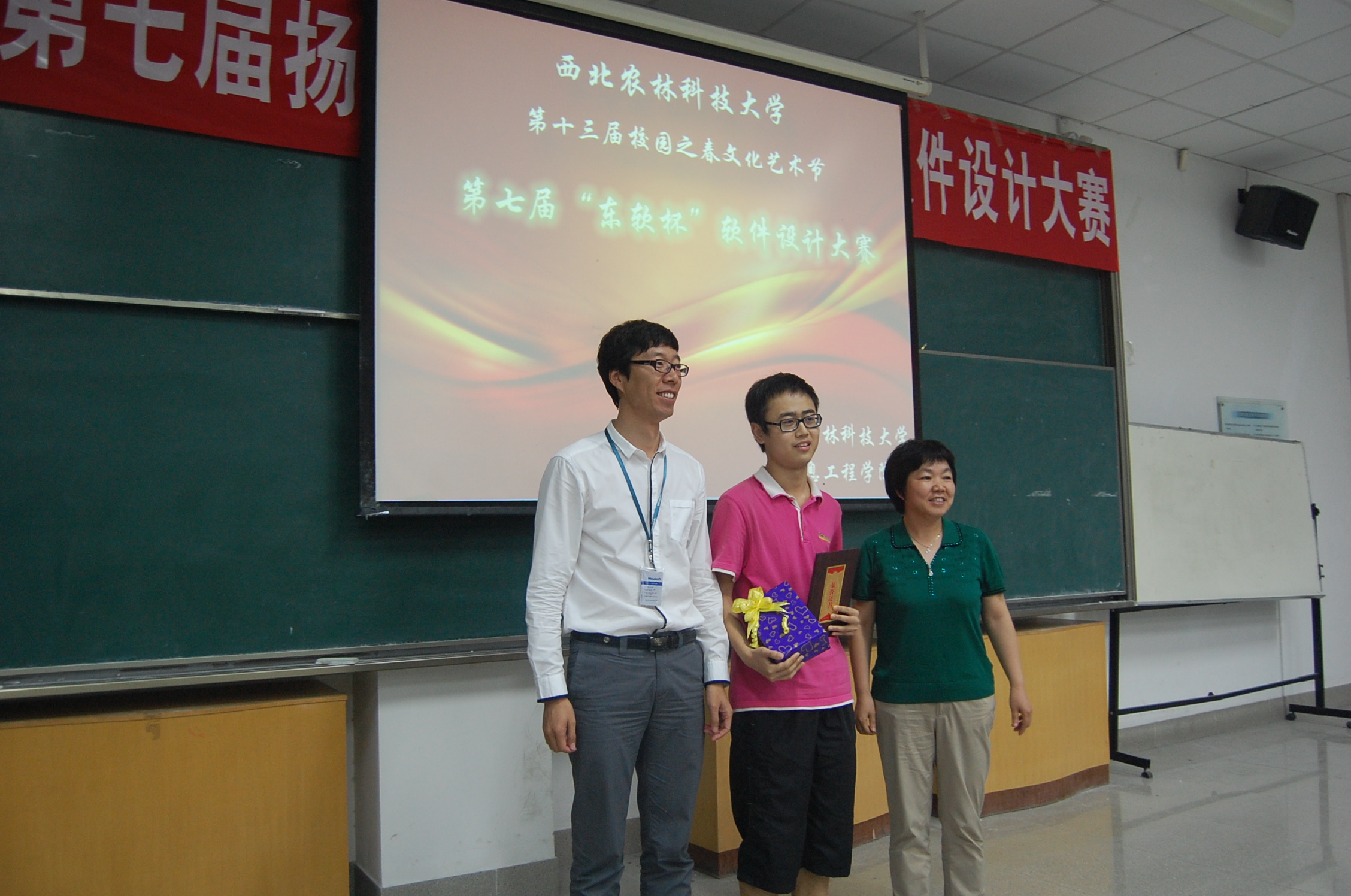 随后进行的作品展示环节是此次比赛的核心部分。入围决赛的作品范围跨度较大,技术水平较高。有既娱乐又动脑的拼图游戏软件、有服务农业的农田杂草图像识别软件、有贴近生活的安卓平台安全卫士软件、有支持旧书营销的管理软件等等。参赛选手联系生活实际,发挥特长,用各种语言编写软件,小巧精致,实用性强,有的甚至已经运用到自己的手机上。大赛中选手们详细介绍了各自的作品,其中软件界面、配乐的匠心独运无不令在座的同学啧啧称奇。参赛队伍的团队合作精神也在作品中充分展现,分工不同的团队成员负责回答评委提问中的某一方面。评委老师针对制作技术、前台平面设计、后台操作等方面给予了精彩点评,赢得了现场同学们的阵阵掌声。大赛共评出一等奖一名,二等奖三名,三等奖四名和优秀奖两名,来自Happy漫画 的尹强同学以其作品《3D俄罗斯方块游戏》获得一等奖,其才华和能力获得了评委的一致称赞。