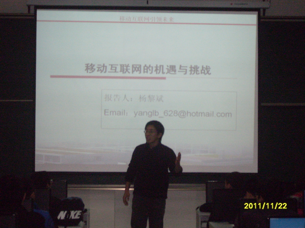 此次报告会中,杨老师首先讲授了移动互联网的定义,又依次讲解了终端、系统平台、应用服务的迅猛发展,让同学们对移动互联网的概念有了一个更加深入的了解。并通过归纳总结得出中国移动互联网腾飞在即的结论。最后,杨老师又回答了现场同学关于WIFI技术、WAPI和WIFI之争以及WIFI与3G技术的融合等方面的问题,使得同学们能够更加深刻地认识到中国移动网络的飞速发展。报告会上,杨老师讲授生动幽默,妙语连珠,引得掌声连连。在座的各位同学们都认真聆听,仿若畅游在高科技的海洋中