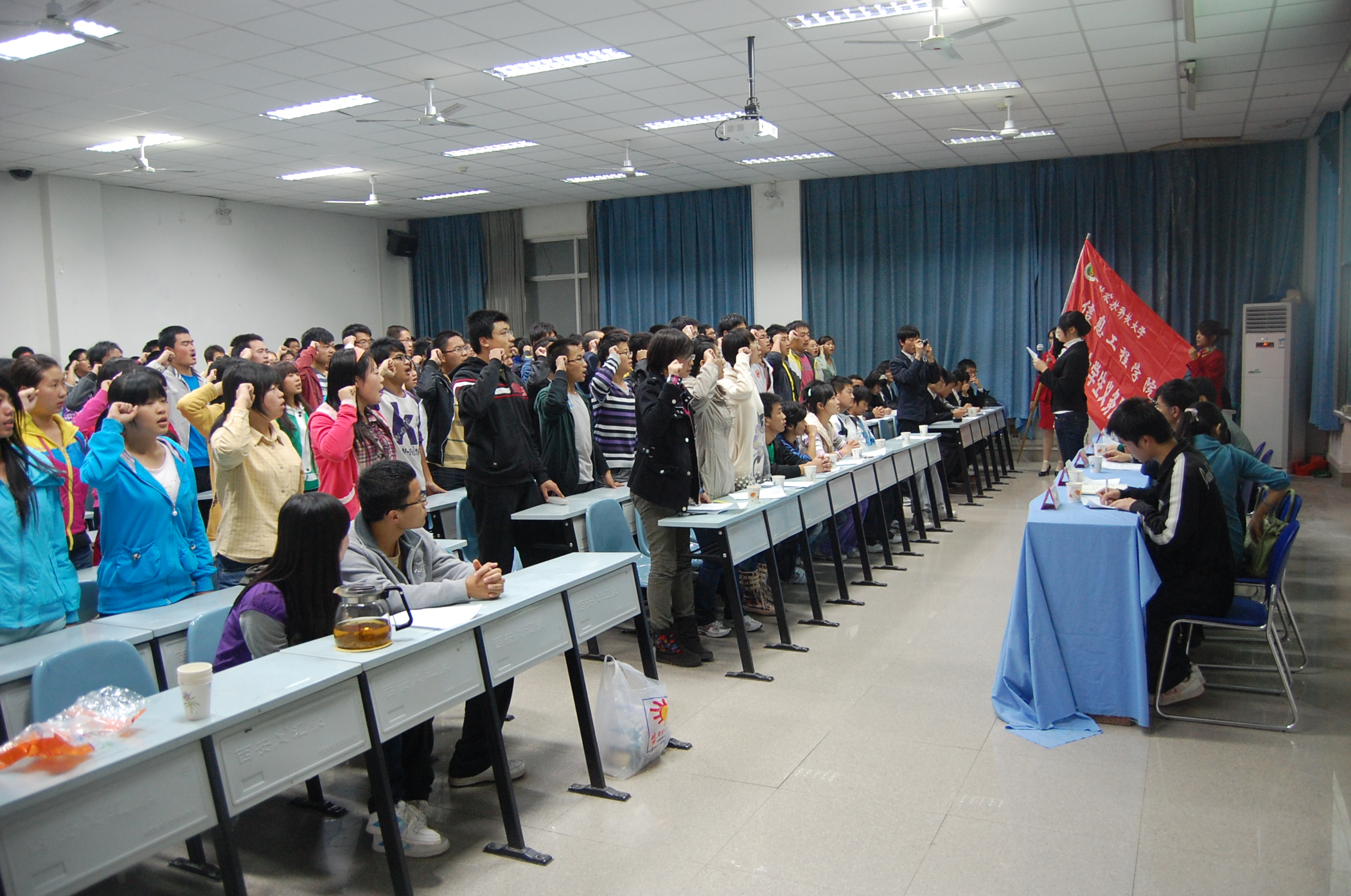接下来举行授旗仪式,谷申杰老师将大旗交到了院阳光团工委支部书记郭荣手中,这一传一接,传递的不仅是一面旗帜,更是一种精神。希望能将感恩奉献、回馈社会的传统发扬光大。在场的同学们做了庄重地宣誓,立志成为一名光荣的义务服务队队员,为社会尽自己的绵薄之力。