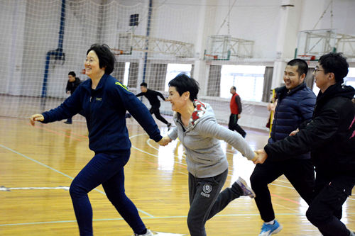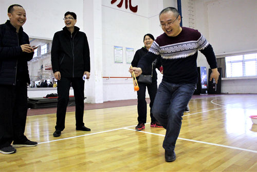 紧接着,是“齐心跳大绳”的比赛,长绳上下翻转,身影灵活的窜动其中,伴随着全场热烈的数秒声,师生们的默契在这一刹那显现的淋漓尽致。随后的“滚雪球”、“金玉满堂”、“蒙眼扎气球”更是将本就热烈的气氛推向了一个高潮,呐喊声、欢呼声,此起彼伏,精彩纷呈的活动,吸引了不少师生驻足观看。